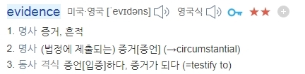 EVIDENCE는 (명) 증거, 흔적 그리고 (동) 증언하다 , 증거가 되다 라는 뜻을 가지고 있습니다.