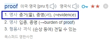 여기서 볼 수 있듯이 proof는 좀 더 완벽한 증거에 가깝습니다.