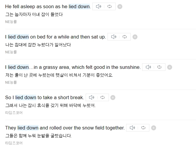 안믿으시는 분들도 계시지만 lied down 으로 구글이나 네이버영어사전에 쳐봐도 엄청 많은 예문이 나옵니다.