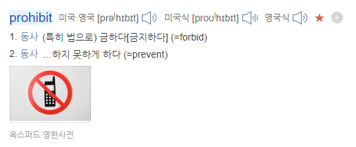 -> 당연히 금지해야 하지만 사회적인 규범/내규를 내포합니다. 다만 설명드린대로 "법"과 관련된 상황에서도 prohibit은 사용이 가능 합니다.