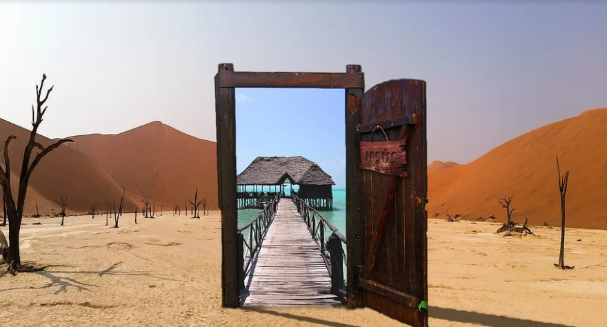 메마른 사막에 문을 열고 가면 바다에 떠 있는 방갈로가 나옵니다.