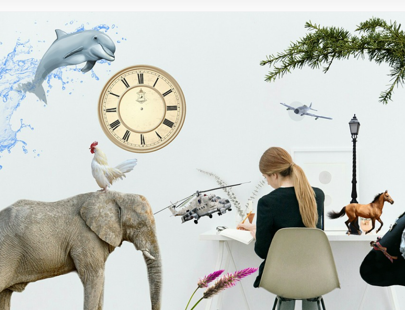 자리에 앉아서 일을 하면서도 주변에는 동물과 나무와 비행기 퇴근시간등 여러가지 생각들이 그 사람(대상)을 둘러 싸고 있는 그림 입니다.