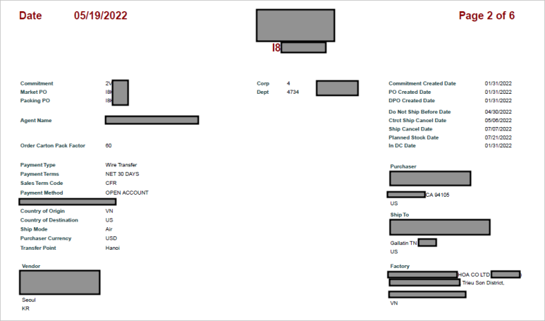 아래는 최종 소비자에게 판매할 수 있는 제품을 발주하는 PO, 즉 출고할 위치와 수량이 기재되어 있는 PO장 입니다.