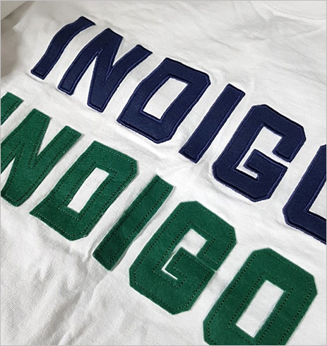 아플리케 (APPLIQUE) : 이미지나, 로고 등의 빈공간에 디자이너의 의도에 맞게 각종 원단이나 휠트지를접착시켜 자수 봉사로 박아서 디자인 효과를 나타내는 방식으로서 고급 스러운 이미지 및 로그 표현을 할 수 있습니다.