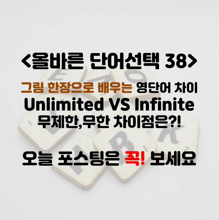 오늘 그림한장으로 배우는 영단어 차이는 무한/무제한 이라는 비슷한 뜻을 가지고 있는 두 단어 Infinite 와 Unlimited 를 가지고 왔습니다. 두 단어의 차이를 간단히 비교하고 끝낼까 하다가, 이 두 단어로 영어의 여러가지 본질적인 이야기를 할 수 있을것 같아 제가 썸네일에 감히 꼭 보라고 문구를 넣었습니다. 한번 저와 같이 차근차근 따라가 보시죠.
