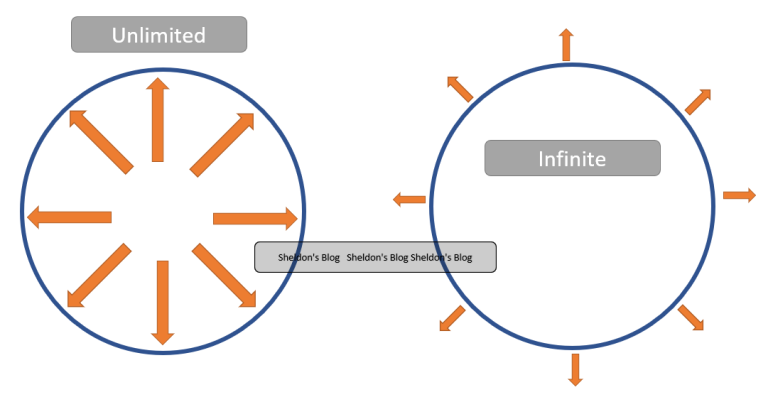 Infinite 는 한계점 자체가 늘어나고 팽창해서 한계점이 어디인지 알수가 없습니다. 어딘지 알수가 없다는 말은 곧 한계점이 없다는 말과 같습니다. 그래서 무한한 이라는 뜻을 가지고 있습니다.