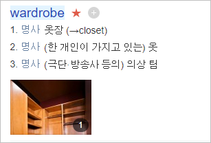 Closet 단어를 살펴보면 명사형으로 벽장 이라는 뜻이 있고, 유의어로는 역시나 wardrobe 라는 단어가 들어가 있어 재미있게도 동일한 이미지를 사용 하고 있습니다.