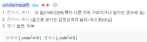 만약 Under만 알고 있었고, 이 영화를 영어로 감상해야 한다면 Underneath를 듣고 무슨뜻이지? 라고 생각할수도 있기에 본인 목표가 어느 수준인지에 따라 이런 단어들도 알고 있으면 좋은지 아닌지를 판단 할 수 있습니다.