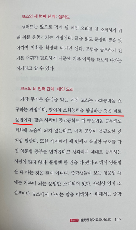 또한 책 중간에 보면 영어공부를 코스요리처럼 순서를 지켜 공부를 해야 한다면서 에피타이저, 샐러드, 메인요리 이런식으로 영어공부의 순서를 제시하고 있습니다.