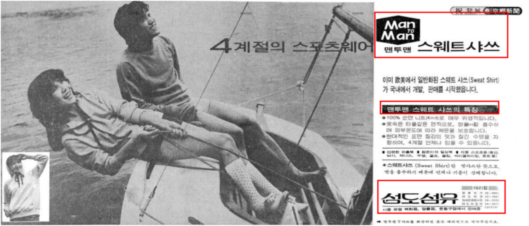 2. 두번째 이야기는 이 sweat shirt를 국내에서 생산을 하는데 "성도섬유" 라는 곳에서 1974년7월27일 경향신문에 이 옷에 대한 광고를 내게 됩니다. 그때 사용한 단어가 "맨투맨 스웨트 샤쓰" 입니다.