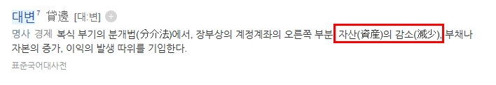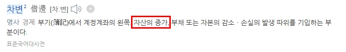 차변이 뭔지 잘 모르는 분들을 위해 국어 사전을 찾아보면 아래와 같습니다.