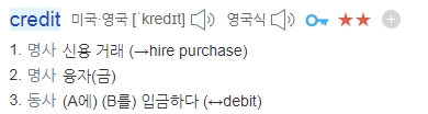 Credit은 굳이 "대변"이라는 단어를 찾아보지 않아도 "융자"라는 뜻으로 결국 부채와 관련된 내용임을 알수 있습니다.