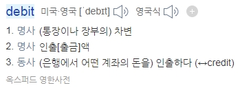 어원을 살펴봤으니 아시겠죠, Debit 은 인출 이라는 뜻을 가지고 있어 직불 카드가 되고