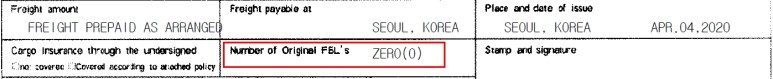 SBL이 발급되면 아래 NUMBER OF ORIGINAL 은 0(ZERO)로 표시 됩니다.