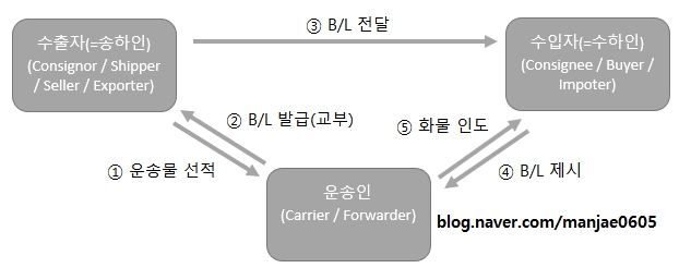쉽게 설명 드리면, B/L은 송하인(consignor/수출자)의 요청에 따라 선박소유자(Forwarder)에서 발행 하며, 이것을 가지고 하역항(양륙항) 에서 수하인(Consignee/수입자)가 물건을 찾을 때 필요한 서류 입니다.
