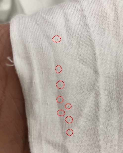 사용폭(cuttable width) 는 텐터 가공을 하면서 변사쪽에 텐터핀으로 인해 사용하지 못하는 변사 부분을 제외 하고 실제로 사용가능한 폭을 말합니다. 통상적으로 전폭에서 약 2" 정도 제합니다. 아래 보면 텐터핀 자국을 볼 수 있습니다. 이부분을 제품에 사용해서는 안되겠지요. 그래서 사용폭은 전폭 보다 항상 작습니다.