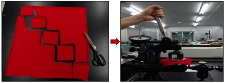 3) 시험편을 기기 매뉴얼의 절차에 따라 견고하게 파지한다. 신축성이 많은 원단은 균일하게 신장시켜 적당히 신축성을 제거하여 파지한다.