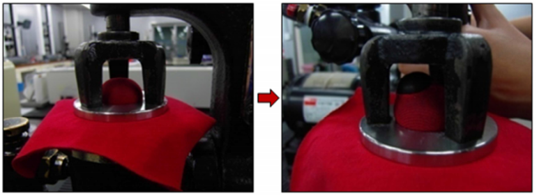 4) 시험편을 고무막 위에 놓고 유체 압력을 증가시켜서 직경 30mm 의 고무막이 팽창하도록 하여 천을 파열시킨다.
