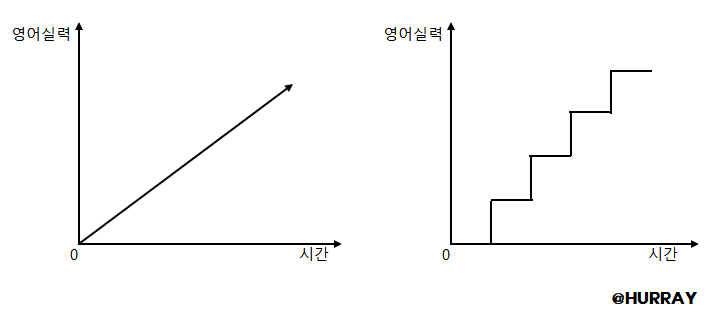 아래 왼쪽 그래프 처럼 영어공부가 학습량에 비례해서 실력이 올라간다면 참 좋겠지만 안타깝게도 오른쪽과 같이 계단형의 그래프로 실력이 상승합니다.