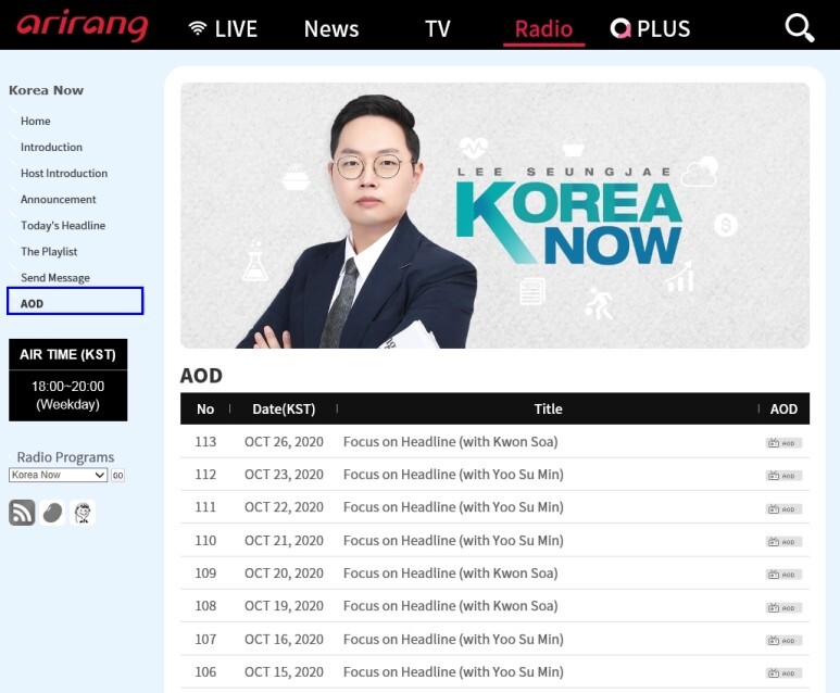 4. Korea NOW를 들어가면 왼쪽에 AOD라고 있습니다.